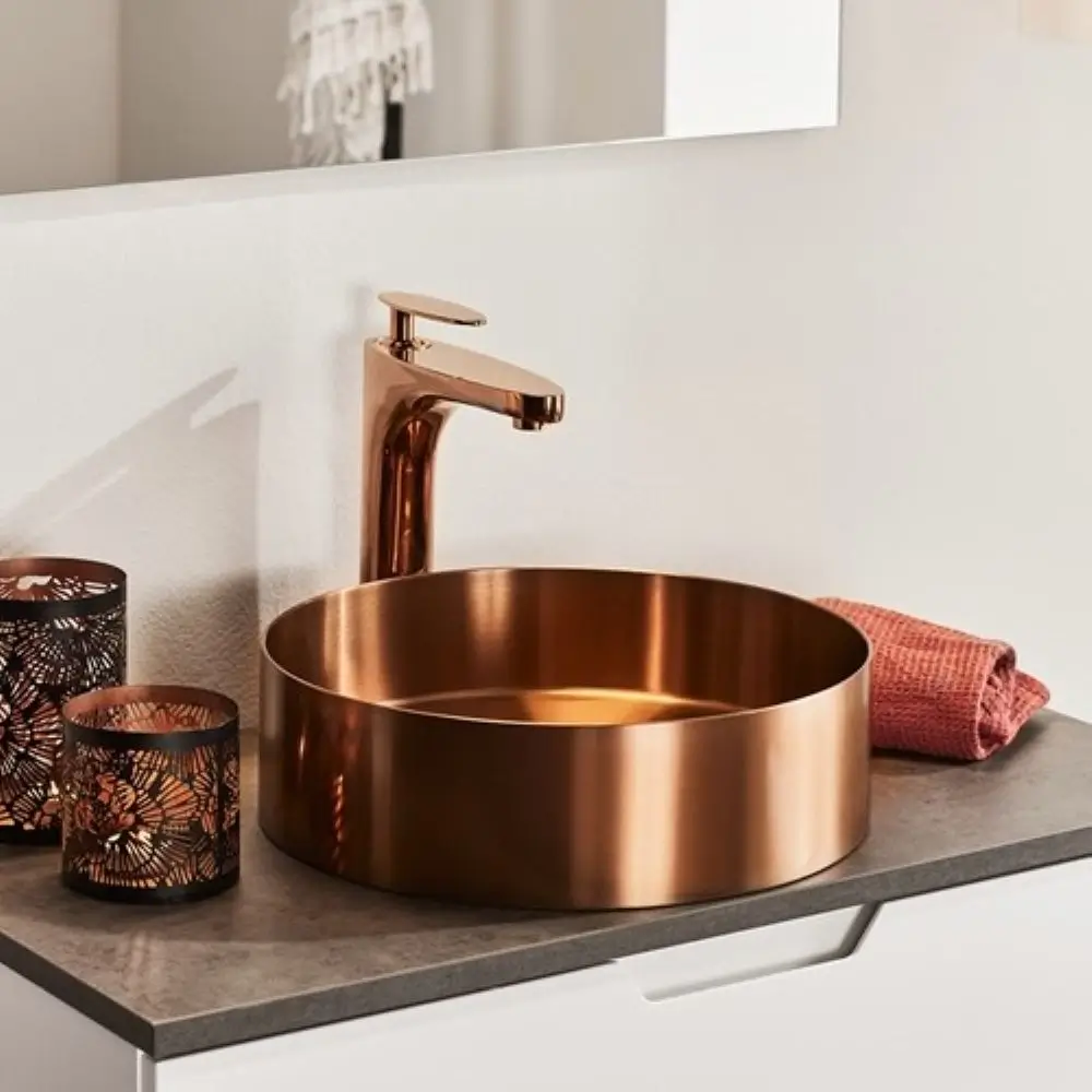 ICON on moderni, pienikokoinen pyöreä allas, joka on suunniteltu asennettavaksi tason päälle. Sen upea kiiltävä kuparinen väri tuo kylpyhuoneeseesi ripauksen luksusta. Altaan kestävä PVD pinnoite, tekee puhtaanapidosta helppoa. ICON pysyy kauniina ja hohtavana vuodesta toiseen.