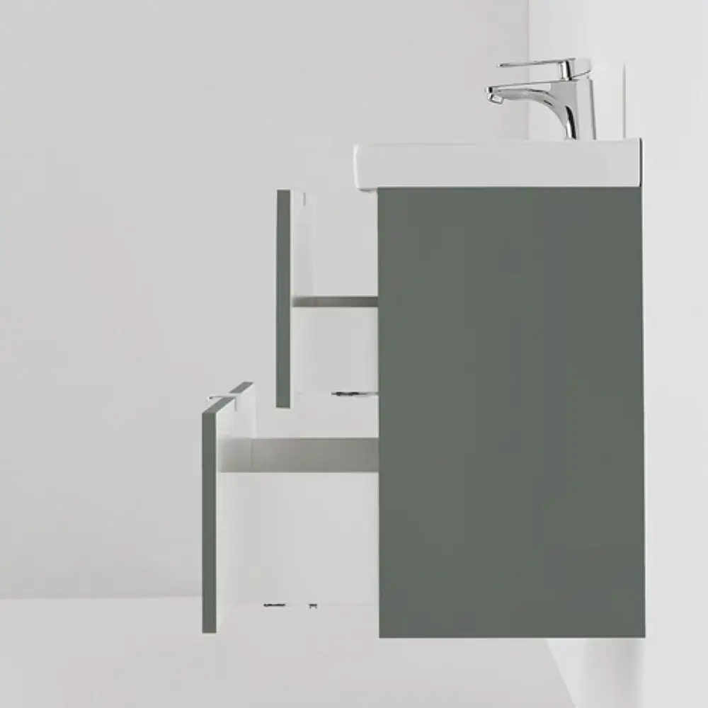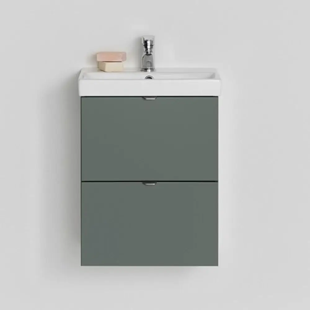 Kauniin vihreä pienikokoinen allaskaappi tuo kylpyhuoneeseesi ripauksen raikkautta. Yhdistä se haluamiisi vetimiin luodaksesi juuri sinun tyyliisi sopivan kokonaisuuden. Mukana tuleva posliininen pesuallas on varustettu ylivuotosuojalla. Tuote toimitetaan valmiiksi koottuna, ja sen asentaminen on helppoa seinäkiskon ja säädettävien ripustushelojen ansiosta.