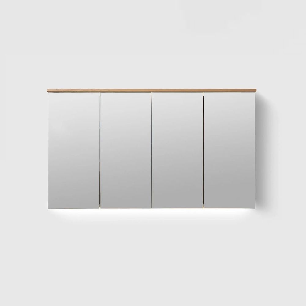Kaapin sisällä sijaitsevat hiekanväriset hyllyt ovat korkeussäädettäviä, joten voit mukauttaa säilytystilaa tarpeidesi mukaan. Integroitu LED-valaistus valaisee kauniisti sekä kaapin päältä että alta, luoden miellyttävän ja käytännöllisen valon esimerkiksi aamutoimiin. Kaapin sisällä oleva pistorasiat lisäävät käyttömukavuutta – voit ladata sähköhammasharjan tai käyttää muita sähkölaitteita vaivattomasti.