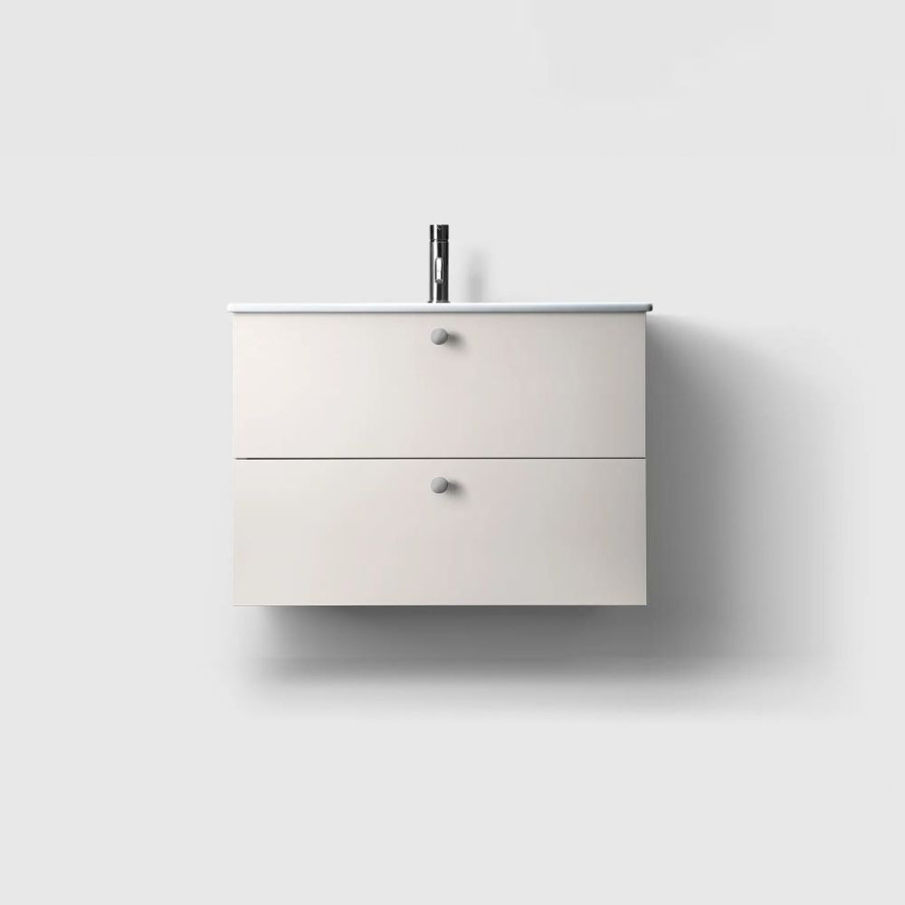 Kalusteissa on tilaa myös käytännölliselle säilytykselle: Vetolaatikossa on vedenkestävät hiekanväriset reunat ja U-muotoiltu pohja, joka takaa riittävästi tilaa putkille ilman, että säilytystila kärsii. Vetolaatikko sulkeutuu pehmeästi ja äänettömästi laadukkaiden Blum Movento -kiskojen ansiosta. Allaskaappi sisältää 15 mm paksuisen posliinitason johon on integroitu allas.