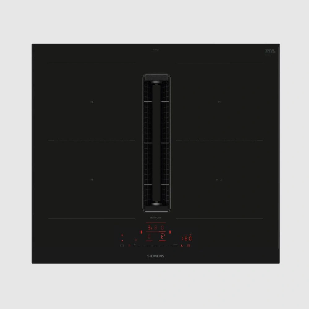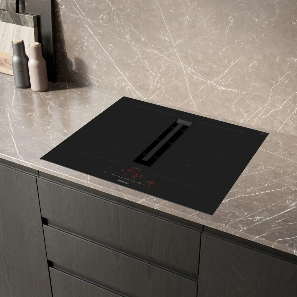 Tämä induktiotaso integroidulla liesituulettimella yhdistää modernin muotoilun ja huipputeknologian saumattomaksi kokonaisuudeksi. Tasoon upotettava ratkaisu pitää keittiön ilmeen selkeänä ja minimalistisena samalla, kun ilmanpoisto toimii tehokkaasti suoraan keittotasolta.