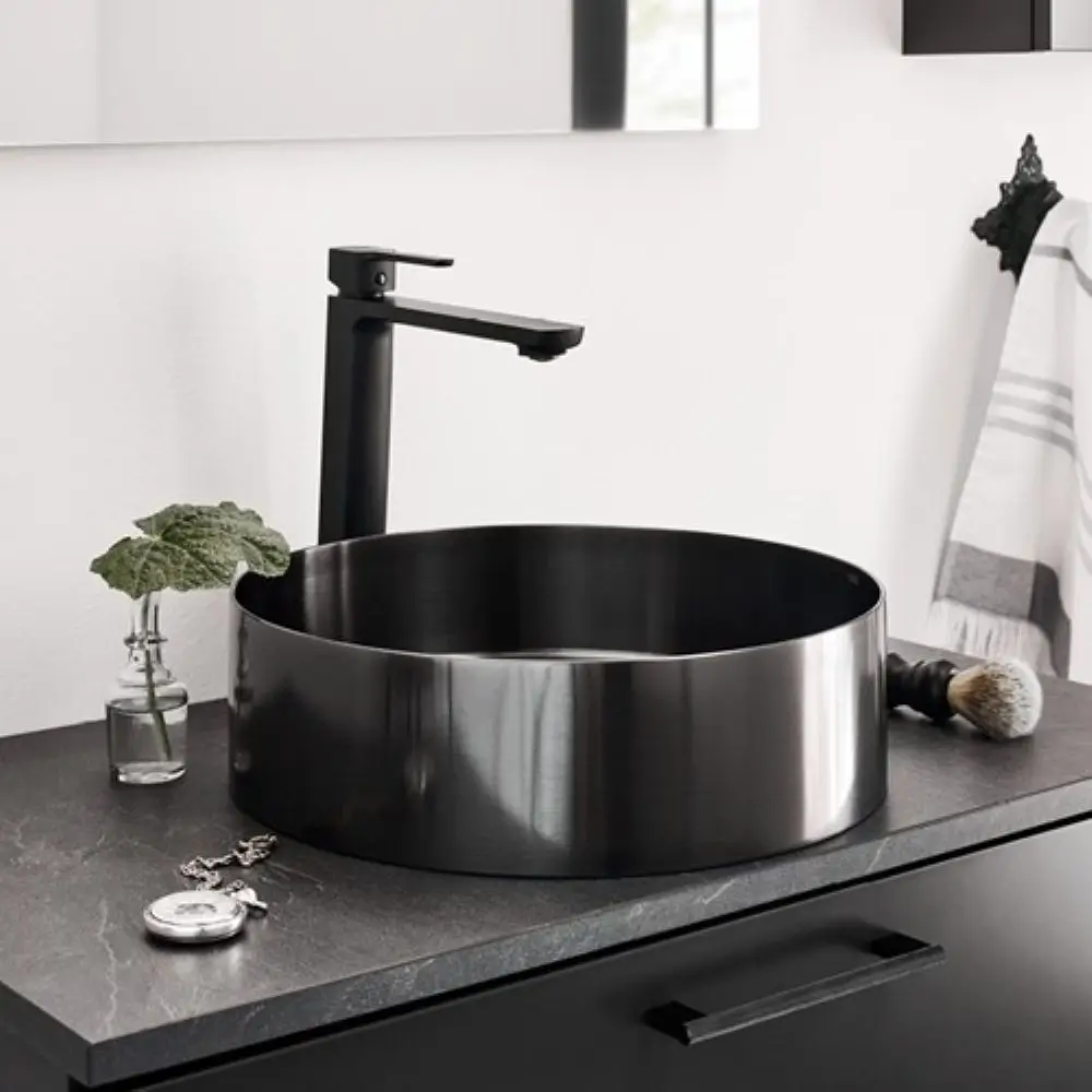 ICON on moderni, pienikokoinen pyöreä allas, joka on suunniteltu asennettavaksi tason päälle. Sen upea mustakromi väri tuo kylpyhuoneeseesi ripauksen luksusta. ICON soveltuu kokonsa puolesta hyvin myös pienempii tiloihin. Sen PVD-pinnoite pitää huolen, ettei allas haalistu elämän pienistä roiskeista, pysyy hohtavana vaikka vaahdottaisit saippuaa kuin mestarikemisti. Tuote ei sisällä ylivuotoaukkoa, mikä lisää sen minimalistista ilmettä.